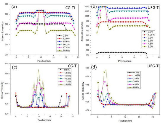Mises equivalent stress is usually used to analyze the deformation of materials under a three-dimensional stress state. The q boils the complex stress state down to a single scalar number, regardless of the mix of normal and shear stresses. The q evolution along the gauge length on the sample surface in the process of tension of both the CG and UFG Ti is given in Figure 9a,b. It can be seen that the q of the necking region increases due to the deformation localization, which introduces multi-axial stress state for the local material. This might lead to activation of more slip systems or other deformation mechanisms, which are not active during plastic deformations in the uniaxial stress due to the high critical slip shear stress (CRSS) of UFG Ti. As a result, the inactive slip systems can be activated in a three-dimensional stress state, more grains in the UFG Ti take part in the sliding, which makes the plastic deformation ability of the UFG Ti in the necking region only slightly smaller than that of CG Ti. Figure 9c,d show the stress triaxility η distribution along the gauge length on the sample surface of both the CG and UFG Ti. During the tensile process, η deviated from 0.33 (uniaxial tension) gradually, and reached the maximum value of 0.525 and 0.55 for CG and UFG Ti, respectively. The stress triaxiality directly affects the fracture strain. Previous studies indicate that smaller stress triaxiality will contribute to the larger fracture elongation [22,23,24] for tensile case. According to the results of FEM, the stress triaxiality of the UFG Ti did not appear to be much different from the CG Ti, which means the difference of the plastic capability under the complex stress state between the UFG Ti and CG Ti is small.