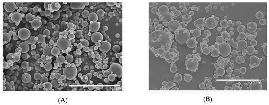 SEM micrographs: (A) whey protein concentrate (WPC) microparticles; (B) eicosapentaenoic acid (EPA)-rich oil-loaded WPC capsules. Scale bar corresponds to 30 µm.