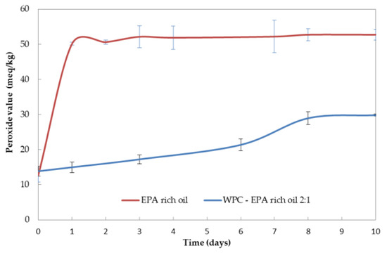 Evolution of the peroxide value of non-encapsulated EPA-rich oil compared with the EPA-loaded WPC microparticles.