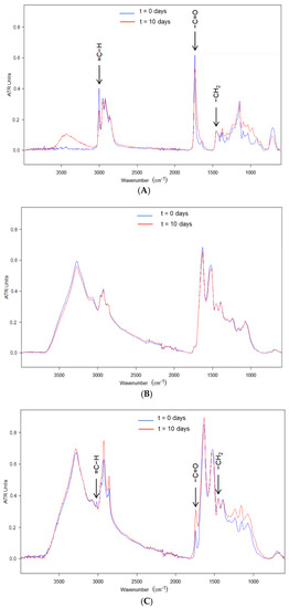 Regarding WPC, the characteristic bands of proteins at 1650 cm−1 and 1550 cm−1 attributed to amide I and amide II [47] were easily discerned in Figure 4B. However, these spectra did not show significant alterations as a result of the exposure to UV light for 10 days, only a slight decrease in the intensity of the bands attributed to water, probably due to the warming provoked by the UV light bulb.