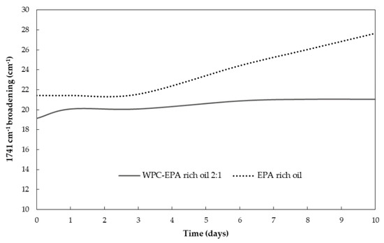 The evolution of the characteristic bands of the EPA-loaded WPC microparticles over UV light exposure time is shown in Figure 4C. The most significant changes were a decrease in the intensity of the band at 3012 cm−1 and an apparent increase in the relative intensity of the band at 1741 cm−1 in addition to a band broadening of the same band. Via UV-vis spectrophotometry, it was also observed the disappearance of the band at 318 nm due to the oxidation of the oil (results not shown). However, as demonstrated in previous work [24], the widening of the peak at 1741 cm−1 is the most suitable to quantify the generation of secondary oxidation products. Therefore, Figure 5 shows the evolution of the 1741 cm−1 broadband at half maximum over UV light exposure time. The band broadening of the free EPA-rich oil was maintained stable until the third day, after which it experienced a significant and strong rise in slope. However, the encapsulated EPA-rich oil into WPC showed a moderate and non-significant broadening during the first day, after which it was arrested. EPA-rich oil seemed to be more stable to UV light when compared to DHA enriched oil, which showed a broadening of approximately 40 cm−1 after being subjected to 10 days under UV light [24]. The different behavior could be due to the different compositions of both oils. Regarding the encapsulates, DHA-loaded WPC microparticles also showed a non-significant broadening of approximately 6 cm−1 after being subjected to 10 days of UV light [24]. The obtained results for the encapsulates indicated that the encapsulation within the WPC protein seems to block UV radiation, decreasing the generation of secondary oxidation products [48].
