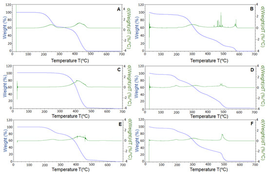 Thermogravimetric analysis curves in the presence of oxygen of (A) EPA-rich oil, (B) EPA-loaded WPC microparticles, (C) docosahexaenoic acid (DHA)-rich oil, (D) DHA-loaded WPC microparticles, (E) EPA–DHA oils mixture (50:50), (F) mixture of EPA-loaded WPC microparticles and DHA-loaded WPC microparticles in mass ratio 50:50.