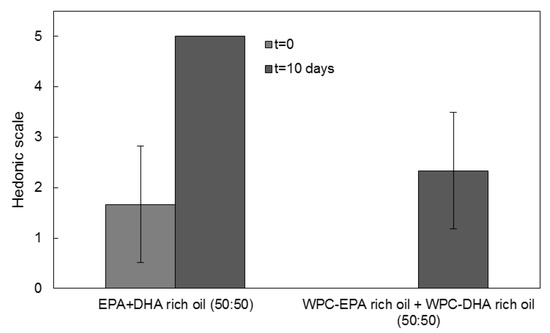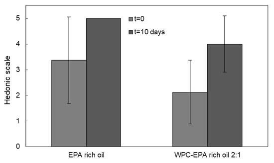The organoleptic impact of the oil-loaded microparticles was evaluated in comparison with the neat EPA-rich oil, employing rehydrated powdered milk as reference. The assay was carried out with fresh samples and the samples upon completion of the accelerated oxidation test. Qualified panelists detected a high organoleptic impact for the free EPA-rich oil, as shown in Figure 8. This result is consistent with the high initial peroxide value and with the fact that the oil suffered from a deodorization process, according to the manufacturer. Nevertheless, the capsules offered a somewhat reduced impact also after 10 days of UV light exposure, according to the panelists, even if the effect was not significant.