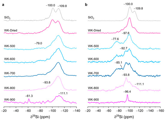 - Kim, H.N.; Lee, S.K. Atomic structure and dehydration mechanism of amorphous silica: Insights from 29Si and 1H solid-state MAS NMR study of SiO2 nanoparticles. Geochim. Cosmochim. Acta 2013, 120, 39–64. [Google Scholar] [CrossRef]