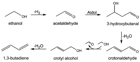 - Angelici, C.; Weckhuysen, B.M.; Bruijnincx, P.C.A. Chemocatalytic Conversion of Ethanol into Butadiene and Other Bulk Chemicals. ChemSusChem 2013, 6, 1595–1614. [Google Scholar] [CrossRef]
