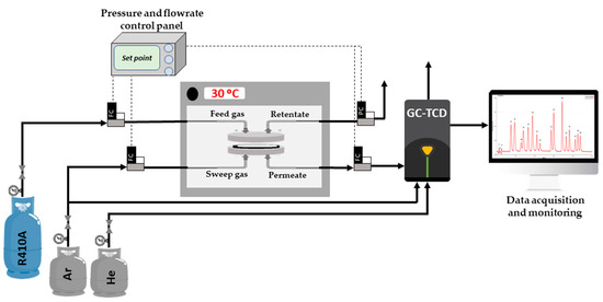 Permeation experiments were performed in continuous operation by feeding the refrigerant mixture R410A inside a custom-made stainless steel permeation cell (see Figure 1). Pressure was controlled thanks to a back-pressure regulator placed in the retentate side of the permeation cell, while an argon stream (4 cm3 STP·min−1 and 1 bar) was used as sweep gas in the permeate side. Concentration under steady state conditions, of R32 and R125, was measured with a gas chromatograph (Agilent 490 micro GC, Barcelona, Spain, equipped with a Pora Plot U column and a thermal conductivity detector). Temperature of the permeation tests was kept constant at 30 °C and the separation performance of the membranes was studied at 1.86 and 4.3 bar of feed pressure.