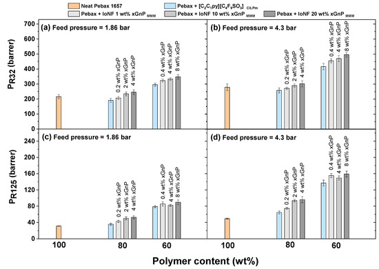 The gas permeability of both R32 and R125, under mixed gas feed conditions and 30 °C, are shown in Figure 3 at different R410A feed pressures (1.86 and 4.3 bar) through all membranes prepared in this work (i.e., neat polymer, CILPMs and MMMs). As can be seen, the smallest molecule R32 (Chung diameter (R32) = 4.02 Å) permeates significantly faster than R125 (Chung diameter (R125) = 4.82 Å) in all the membranes tested. These results confirm the trend that has been already reported in a previous study regarding the performance of Pebax®1657-based CILPMs to separate R32 and R125 [23] and support the validity of this type of material for the selective recovery of R32.