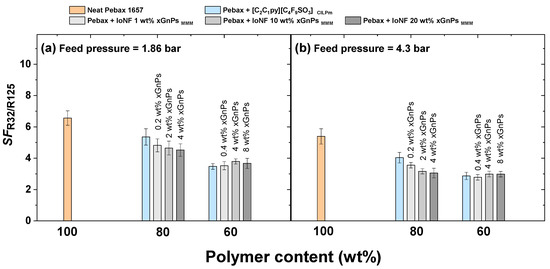 In this regard, Figure 4 shows the separation factor (Equation (3)) as a function of the mass percentage of polymer, at the two pressures of R410A tested (1.86 and 4.3 bar) and for the nine membranes studied in this work. The results show that the presence of the FIL reduces the selectivity performance of CILPMs with respect to the pure polymer. This trend is also confirmed upon higher concentrations of IL in the CILPM and at higher pressures. This is in very good agreement with the fact that the functional properties of CILPMs prepared with highly fluorinated ILs result in very noticeable increases in gas permeability, yet at the expense of reducing the separation factor. For instance, a reduction of the selectivity of a Pebax®1657-based CILPM prepared with [C2C1im][Tf2N] with respect to neat Pebax®1657 has been previously observed for the separation of a R410A mixture [23]. For CILPMs-based separations of other gas mixtures, such as CO2/CH4 or CO2/N2, the IL [C4C1im][Tf2N], which exhibits a high degree of fluorination, also presents the highest values of CO2 permeability at the expense of a selectivity decline [61]. Concerning the effect of the working pressure, the decrease in the separation factor as the pressure increases is a quite frequent phenomenon, especially in high sorbing rubbery polymers with high plasticizing behavior under mixed gas experimental conditions [22,23,62].