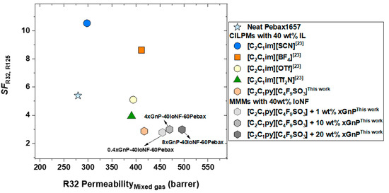 An overview of the separation performance of the MMMs prepared in this work is presented in Figure 5 in the form of a Robeson type diagram ( vs. R32 permeability under mixed gas conditions). Here, the separation factor of the MMMs manufactured with 60 wt% Pebax®1657 and 40 wt% of IoNF is compared, at the same R410A feed pressure of 4.3 bar and polymer content, with that of the CILPMs previously studied. It is first observed that the IL used in the present work notably improves R32 permeability with respect to the ILs [C2C1im][SCN], [C2C1im][BF4], [C2C1im][OTf], and [C2C1im][Tf2N] at the expense of a lower selectivity. Furthermore, considering that the addition of xGnP to the MMMs improves gas permeability while keeping stable as previously stated, we hypothesize that MMMs prepared with IoNF based on more selective ILs such as [C2C1im][SCN] and [C2C1im][BF4] would allow pushing the limits of these hybrid membranes toward more attractive R32 permeability values, similar to those observed in this work, while providing high separation factors. This would require further dedicated research to study the surface behavior of these ILs and their ability to exfoliate the xGnP and produce stable IoNFs as efficiently as the FIL [C2C1py][C4F9SO3].
