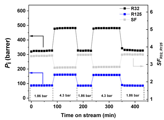 Another important aspect to study in this type of hybrid materials is their separation performance over a sustained period of time under different operating pressures. Figure 6 shows the permeability of R32 and R125 as well as versus time on stream for 430 min through the MMM 4xGnP-40IoNF-60Pebax. It is observed that under these cyclic changes of pressure, the MMM exhibits a robust behavior without changes in the gas permeability and separation factor observed at each pressure.