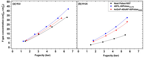Figure 7a,b illustrate the sorption isotherms of R32 and R125, respectively, as a function of gas fugacity. The Flory–Huggins (FH) model (Equation (8)) was used to fit the experimental data. This model is able to accurately describe sorption isotherms of highly-sorbing species, such as vapors or condensable gases, that frequently form solute clusters during the sorption process into rubbery polymers [66]. This type of behavior is characterized by sorption isotherms that are convex to the fugacity axis as those shown in Figure 7. An additional advantage of using the FH model is that it provides insight on the polymer-gas interactions through the interaction parameter [67]. In particular, values greater than 2 are an indication of small polymer-gas interactions, and values lower than 0.5 are indicative of very strong interactions [68].