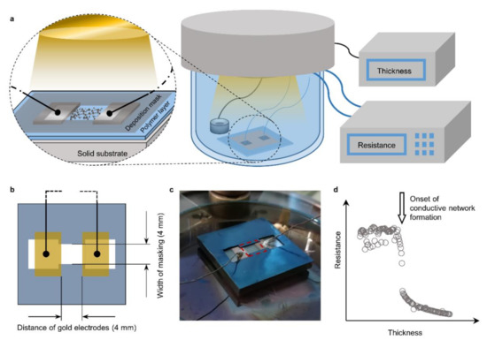 Metal thin films were deposited with a DC-magnetron sputter coater with Argon (99.999%) as the sputtering gas at a pressure of 0.9–1.2 × 10−2 mbar. The nominal thickness (d) of the growing film was monitored with a quartz crystal microbalance. For the investigation of the resistance (R) of the thin films, in situ resistance measurements were conducted during sputter deposition (Figure 1a).