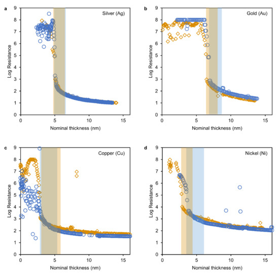Thus, the acquired data indicate that in all experiments the thin film formation progressed from nucleation of clusters to a stage of coalescence and through the percolation into a conducting network to a final uniform film (Volmer–Weber growth). Note the fluctuating values of high resistance before the onset of conductivity in the low thickness regions. This conductivity can be attributed to the plasma which is present in the deposition chamber as these low resistances were only observable during the deposition and no conduction was observable when the deposition was interrupted. Also note the comparatively low resistance in the region before percolation during one measurement of copper (Figure 2c, blue circles). This resulted from using a specific measurement range of the LCR-device before changing to automatic shortly before the transition region.