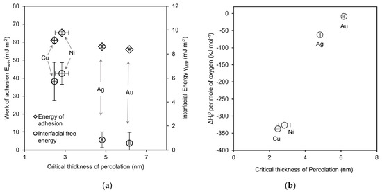 Plots of (a) energy of adhesion (Eadh) and interfacial energy (γM/P) and (b) standard heat of metal-oxide formation (ΔHf0) per mole of oxygen versus critical thickness of percolation for the investigated elements as indicated. Vertical error bars represent standard deviation, horizontal error bars represent sample range of dc.