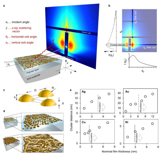 Certain observable characteristic features of the scattering curves (maxima or shoulders, see Figure S4) can be ascribed to the interference function, which reflects the cluster positions as they are arranged on the surface with a certain degree of order. To extract geometric information about the isolated clusters on the surface it is very common to approximate their shape as spherical caps and their assembly with a hexagonal lattice. This can be simplified to an equilateral triangular unit cell (Figure 4c). Given sufficient size and disorder of the metal clusters it is conceivable that they will eventually percolate to form a conductive network well before a close-packed arrangement is established (Figure 4d). However, metal clusters that are not entirely (hemi) spherical in shape but display an elongated or frayed shape causing an earlier onset of percolation might be expected. In spite of a certain disorder, for such an arrangement of clusters a characteristic average distance D to the nearest neighbors can be readily analyzed from Kratky plots of the qy-data [46] (Figure S2). The qy-positions of Gaussian functions, fit to the characteristic peaks that stem from the interference function, give an estimate of the average cluster distance D (Figure 4c). Furthermore, this estimated cluster distance can be utilized to discriminate between different growth regimes based on its rate of change with nominal thickness [19,38,47,48]. The evolution of this parameter for each metal (Figure 4e) can be interpreted to be subject to such a change. As indicated, the transitions to another rate of change coincides, most notably for copper and gold, with the onset of percolation at the critical thickness dc. In fact, an additional transition should be visible for the crossover from nucleation to coalescence [47] at low nominal thicknesses which is, however, not resolved by the present investigations.