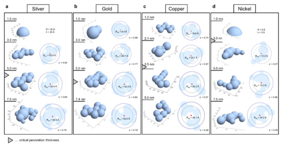 For all four metals a consistent trend of increasing cluster size with increasing film thickness was found. However, considerable differences in cluster size with respect to the different metals can be observed with gold exhibiting the largest and nickel the smallest average cluster size. Cluster shapes evolve from mostly spherical at the lowest thickness to more irregular, elongated and branched. This is indicated by initially high values of ε declining towards percolation and again higher values for thicker films. This aligns well with the notion of incomplete coalescence after a certain thickness and the filling of gaps after percolation. Interestingly, gold clusters at 1.0 nm thickness (Figure 5b) were estimated to exhibit the smallest radius (Req is the radius of a sphere with equivalent radius of gyration, see Supplementary Materials Section 7). This can be rationalized by adhesion energy and the low tendency for bonding so that gold clusters form the smallest interface area and most spherical clusters. Spheres accommodate more material than shallow clusters with identical radius and are accordingly smaller. All other geometries at 1 nm thickness must be shallower to fit the experimental PDDs. It is also worth noting that the geometries of silver and gold clusters, which exhibit the highest onsets of percolation, display markedly more compact and circular footprints with ε values around 0.7–0.8 (Figure 5a,b) than those of copper and nickel with ε values near 0.6 (Figure 5c,d). This is in accordance with the notion that more spread out and branched structures undergo percolation earlier as well as the concept of adhesion energy determining the tendency to form an interface with the surface. It also falls in line with higher metal reactivity diminishing cluster mobility by bonding to the surface since mobility is needed to relax into a spherical geometry. More resulting morphologies are discussed in detail in Supplementary Materials Section 8.