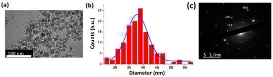 A typical HR-TEM image of laser-synthesized Si NPs with corresponding statistical size analysis and electron diffraction pattern is shown in Figure 1. As shown in the figure, laser-synthesized Si NPs had the characteristic spherical shape, while the statistical analysis reveals the mean size of about 37 ± 3 nm. As follows from the electron diffraction pattern (Figure 1c) and a corresponding lattice constant table (Table 1), the formed nanoparticles were crystalline, which is confirmed by the presence of diffraction rings, corresponding to (111), (220), and (400) crystalline planes of cubic diamond structure.