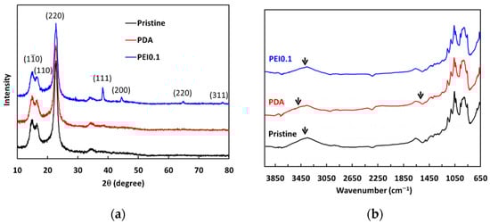 From the above results, we found that the nanocomplexes of PEI0.1 had the best dispersibility. Therefore, we further analyzed XRD patterns to understand more detailed structural information (Figure 4a). For pristine cellulose papers, the characteristic peaks at 2θ = 14.7°, 16.8°, and 22.8° correspond to the (10), (110), and (220) crystallographic planes of the monolithic cellulose type I, respectively [24]. The XRD patterns of the PDA samples are not significantly different from those of the pristine filter papers. In the XRD patterns of the PEI0.1 samples, there are four extra characteristic peaks of silver at 2θ = 38°, 44°, 64°, and 77°, corresponding to the (111), (200), (220), and (311) planes, respectively. The peaks of the PEI0.1 filter papers matched well with those of the face-centered cubic crystal structure of silver (JCPDS No. 65-2871) [25]. The results verify the successful immobilization of PDA/PEI/Ag nanocomplexes on the filter papers as a result of the reductive effect of the catechol groups.