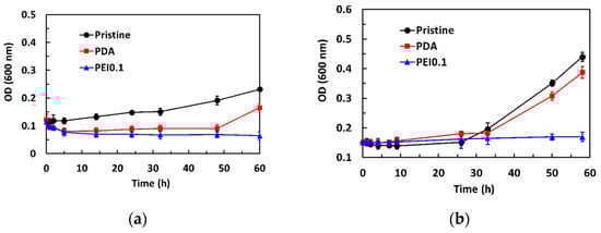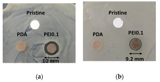 Previous studies have reported that PDA coatings have a moderate antibacterial effect [27,28]. In our work, using a dynamic contact test, we observed a similar antimicrobial activity of PDA against Gram-positive S. aureus but not against Gram-negative E. coli. The difference in the antibacterial effect between Gram-positive and Gram-negative bacteria might be related to their cell wall composition. Gram-positive bacteria have cell walls composed of peptidoglycan, while Gram-negative bacteria have an outer membrane composed of lipopolysaccharides in addition to cell walls composed of peptidoglycan [29]. The outer lipopolysaccharide layer of Gram-negative bacteria probably prevented PDA from passing through the cell wall. Thus, the antibacterial efficacy of PDA was better against S. aureus than E. coli. Although S. aureus and E. coli were not eliminated by the PDA, the growth of S. aureus and E. coli could be effectively inhibited by the developed PEI0.1 filter papers.