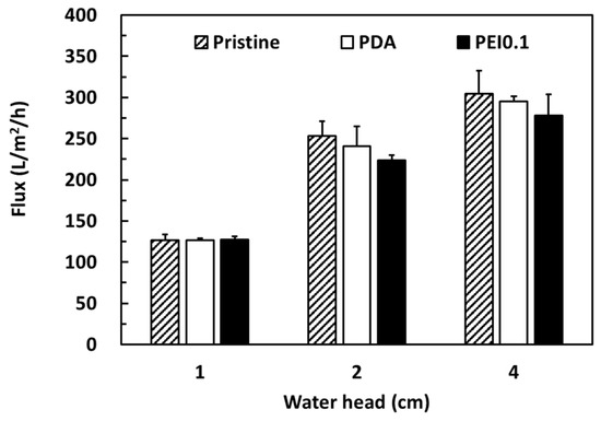 Cellulose filter papers are widely used in gravity filtration and are separated by trapping the particles in a random matrix of cellulosic fibers. Here, we attempted to use the PDA/Ag/PEI nanocomplex-incorporated cellulose papers as filter membranes for bacterial removal. According to previous works, PDA-modified membranes have a lower flux and longer filtration cycle than other membranes because their denser PDA coating blocks the porous fabric matrix [30,31]. To confirm that the PDA/PEI/Ag coating did not seriously reduce the filtration ability, the water flux of different coating filter papers was investigated. Figure 7 shows a comparison of the pure water flux performances of the pristine, PDA, and PEI0.1 filter papers under gravity-driven conditions with a water head of 1, 2, and 4 cm. As expected, the water flux (approximately 300 L/m2/h) was the highest at a water head of 4 cm and the lowest (approximately 125 L/m2/h) at a water head of 1 cm. Under various water head conditions, the water flux of the pristine, PDA, and PEI0.1 filter papers was similar. Despite the PDA/PEI/Ag nanocomplexes anchored on the surface, probably blocking the pores to some extent, their water flux under various water heads was similar to the corresponding value of the pristine filter papers. These results suggest that the permeability of the PEI0.1 filter paper was sufficiently high for gravity filtration.
