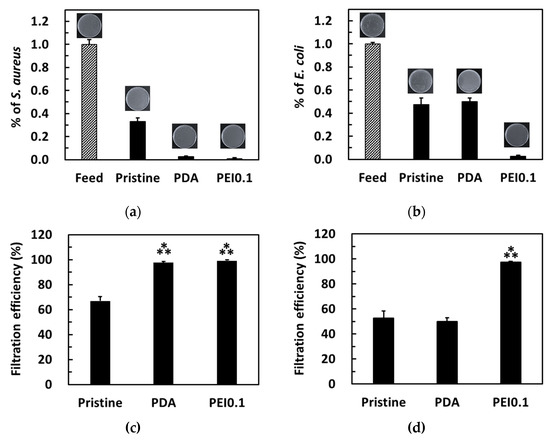 The bacterial filtration efficiency was further tested using a simple gravity-driven filtration experiment. After filtration, some bacteria were detected in the filtrates of the pristine and PDA filter papers, while no bacteria were detected in the filtrates of the PEI0.1 filter papers (Figure 8a,b). For S. aureus, the pristine, PDA, and Ag filter papers provided a filtration ability of approximately 67%, 97.6%, and 99.5%, respectively (Figure 8c). For E. coli, both pristine and PDA filter papers provided a filtration ability of approximately 50% (Figure 8d). Notably, only 2.7% of E. coli was found in the filtrate of the PEI0.1 filter papers, indicating an excellent filtration efficiency. Because the pristine filter papers did not show any AgNP loading and bactericidal effect, the filtration efficiency can be attributed to physical removal [32]. Compared to the pristine filter papers, the PEI0.1 filter papers provide an additional antibacterial filtration efficiency because of the silver’s biocidal efficacy.