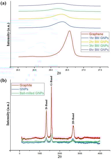 Figure 1b shows the Raman spectrum of graphite for as-received GNPs and 3-h ball-milled GNPs. As the nanoplatelets are ball milled, the Full Width at Half Maximum (FWHM) of D the peak increases from 50 to 59 cm−1, which is the result of the disorder. The intensity of the 2D band, after ball milling, decreases, and the peak broadens. The decrease in intensity of 2D band is due to the disorder along the “c” axis and is proportional to the crystal size []. This result ties well with XRD results wherein the disorder increases after ball-milling of GNPs. A similar conclusion was reached and explained by Kaniyoor et al. [], where a high amount of defect can suppress the 2D-band and a bump-like region emerges. Since no chemical treatments were performed on the GNPs samples, the peculiar 2D-band shape cannot be due to functional groups, and the defects are the reason for the appearance of the 2D-band shape. This aspect of the research could simply mean that the D-band appears in graphite only in defective/disordered samples or at the edges. Thus, as mentioned earlier, the ball-milling process transformed the large crystallites into small particles and introduced a significant number of defects.