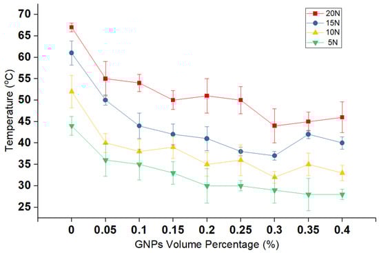 The variation of surface temperature at different volume percentages of GNPs at several loads.