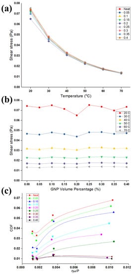 The increase in viscosity of nanolubricants after the addition of GNPs is insignificant. Figure 4b highlights that viscosity is slightly constant at a certain temperature with adding a different concentration of GNPs. It obtained comprehensive results, proving that these nanolubricants have a linear relationship between viscosity and shear stress. These findings support the notion that nanolubricants behave as a Newtonian fluid, where viscosity remains constant, no matter the shear applied load, at a constant temperature. The reason for this behavior remains unclear, as most of the existing explanations seem to be speculative [,]. However, Heine et al. [] investigated through the molecular dynamics simulations of equilibrium structure and the response to imposed shear on suspensions of spheres, rods, plates, and jacks, that the rod and plate systems show noticeable particle alignment, which helps to minimize the frequency of particle collisions. Similarly, it is expected that the GNPs having sheet structure could align themselves along the shear direction; this requires further investigation.