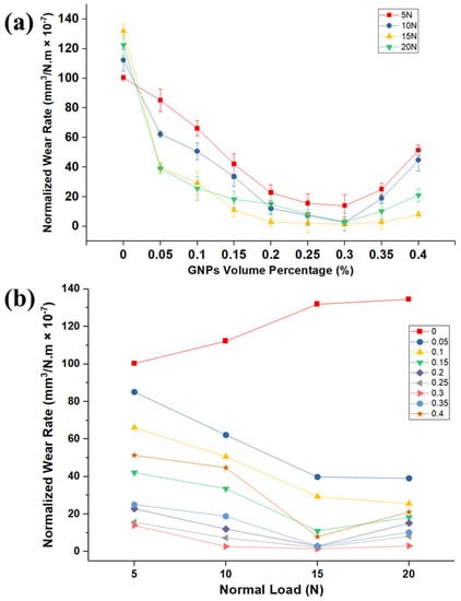 (a) The variation of wear rate in different volume percentage of GNPs at several loads. (b) The variation of wear rate in different loads at several volume percentages of GNPs.