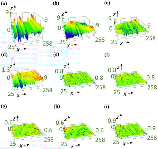 The 3D optical profilometer images of worn surface of the pin at 20 N for the (a) neat oil, (b) 0.05 vol.% nanolubricant, (c) 0.10 vol.% nanolubricant, (d) 0.15 vol.% nanolubricant, (e) 0.20 vol.% nanolubricant, (f) 0.25 vol.% nanolubricant, (g) 0.30 vol.% nanolubricant, (h) 0.35 vol.% nanolubricant, and (i) 0.40 vol.% nanolubricant.