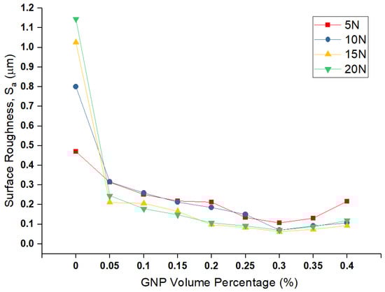 The Sa values of the worn pin surfaces for various nanolubricants at different normal load are depicted in Figure 7, which shows a relationship between the surface roughness and volume fraction of GNPs. By comparing the roughness value of neat-oil tested sample with nanolubricants, it is obvious that nanolubricants are effective to enhance the wear resistance, due to less damage and failure on the surface by having low surface roughness values. Moreover, the roughness value of the worn surface decreases by increasing the volume percentage of GNPs in nanolubricants up to 0.30 vol.%, with the same trend of wear rate. Hence, amongst the nanolubricants, the lowest roughness belongs to 0.30 vol.% nanolubricants, as is expected from wear data from Figure 5. Therefore, it can confirm the claim that GNPs can fill up the valleys of asperities, to smooth the surfaces, and reduce the surface interlocking and shear stresses between two surfaces, to reduce the wear. Besides, nanolubricant with a higher GNPs volume percentage can fill up more gaps, cover more area of surfaces, and, hence, provide more protection on the surfaces. Therefore, the surface finish is smoother for nanolubricants with more GNPs. On the other hand, adding GNPs more than 0.30 vol.% has a negative effect, as the surface roughness increases due to agglomerated GNPs, which behave like a third-body abrasive particle due to their plate-like geometry, which damages the pin surface by plastic deformation and ploughing and can cause an increase in the wear volume rate and, consequently, rougher surfaces.