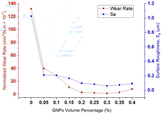 Figure 8 shows the relationship between wear rate and surface roughness at 15 N. A direct relationship between Sa and wear rate, and also a sharp reduction in wear rate and Sa by adding 0.5 wt.% graphene, can be observed. Moreover, the surface-roughness increment from 0.35 wt.% to 0.40 vol.% graphene is in line with the increasing wear rate. Therefore, all samples are corresponding to a direct relationship between wear rate and surface roughness.