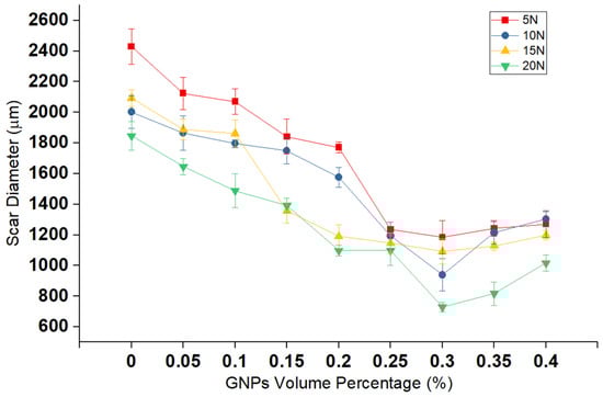 After each test, the worn surface is flat, and each worn pin has a unique wear-scar diameter that relates to the wear rate of samples. Figure 9 depicts the scar diameter of the pin at 15 N applied load for neat oil and nanolubricants. As shown in Figure 9, the diameter of the pin is larger for the sample tested with neat oil (Figure 9a), in comparison with nanolubricant (Figure 9b,c), as is expected because of the higher wear rate for neat oil sample. Figure 10 exhibits the correlation between scar diameter and GNPs volume percentage at different loads. The trend of wear scar diameter versus volume fraction of GNPs is the same as that of wear rate versus surface roughness, as expected.