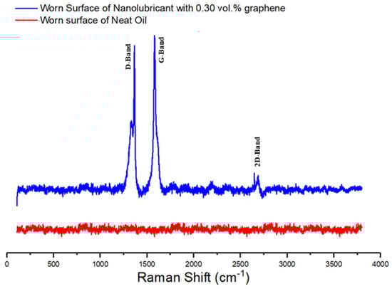 To have an understanding of the chemistry of surfaces, the full Raman spectra of worn surface of sample lubricated by neat oil and nanolubricant with 0.30 vol.% GNPs is shown in Figure 11. It is apparent from Raman spectra on the wear surface lubricated by the neat oil that the aluminum pin surface proves no existence of any type of carbonaceous materials, because of no existence of D-, G-, and 2D band in the Raman spectra. In contrast to this finding, however, evidence of carbonous materials was detected on the worn surface lubricated with the nanolubricant, due to the exhibition of strong D- and G-band in the Raman spectrum. This appears to be a case of partial covering of the worn surface with carbonaceous materials. Moreover, it is worth discussing these interesting facts that a disordered structure appears to be well supported by the presence of the D-peak in the Raman spectra. The intensity of the D peak after the tribology test increased significantly. The results of this study explain the occurrence of these phenomena. The ID/IG ratio is equal to 0.96 after wear test (Figure 11), whereas the ratio was equal to 0.72 before the tests. This shows that the disorder in the ball milled GNPs crystallite structure increased slightly. The ratio of the D- and G-band intensities (ID/IG) is inversely proportional to the in-plane crystallite size La []. The in-plane crystallite size (La) from the Raman spectra taken before and after the wear tests (Figure 1b and Figure 11) is calculated by using the general equation La = (2.4 × 10−10) λ4laser (ID/IG)−1, where λlaser is the wavelength of the laser light in nm unit []. The crystallite sizes obtained at different spots, using this equation, are given in Table 2. The in-plane crystallite size decreased significantly after the wear tests, as shown in Table 2. As a result, the analysis result verifies the deposition of a carbonaceous film on the worn surface during the wear process, and the wear track surface is almost covered by the carbonaceous film after the tribological test. Consequently, the addition of GNPs into the oil clearly gives a positive effect on friction and wear properties.