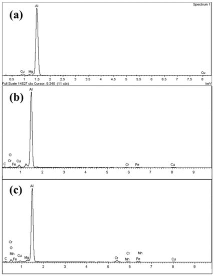 To investigate the chemical composition of worn surfaces, EDX was employed. Figure 13a presents the EDX spectrum of pin surfaces before the wear test. As one expects, a majority of the unworn surfaces are made of aluminum with some minor trace of the copper and magnesium because the pin-sample surfaces studied in this work are the 2024 aluminum pin. Meanwhile, Figure 13b,c is EDX results of the worn samples under a neat oil and nanolubricants that demonstrate a majority of worn surfaces are composed of aluminum and a trace of iron and chromium on the surface and inside the wear grooves.