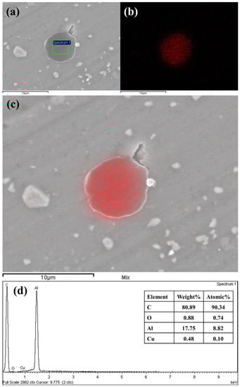 The EDX analysis for a sample surface lubricated with 0.3wt.% of GNPs at 20 N load is depicted in Figure 14. Strong evidence of traces of the element carbon on the surfaces was found from the EDX results when the surface was exposed to nanolubricants during the test. This suggests that GNPs play a significant role in acting upon the contact surfaces where the high concentration of carbon on the surface now provides evidence that the GNPs are still largely intact on the surface. Together, these results provide important insights that the lubricant tribolayer is deposited on the worn surfaces for tested samples with nanolubricant containing GNPs. This is in contrast to the EDX of the worn surface, which was tested by neat oil with no carbonaceous film, as it has no signs of carbon. Figure 14a–c shows the carbon element mapping of the worn surface. Generally, the darker areas in the SEM images belong to higher concentrations of carbon, signifying that GNPs may be transferred and deposited in these dark areas of worn surface and form a tribolayer. The result of this analysis indicates a distribution of nanoparticles transferring and sticking to the worn surface, inside and outside of the wear grooves that the notable improvements in friction and wear rate are achieved. The same opinions represent other tested samples where the carbon element trace appears on the SEM and EDX results and exhibits a random carbon distribution on the worn surfaces. Using EDX, the average weight fraction of carbon detected on the surfaces tested by nanolubricants was measured to be 12–95%, depending on the volume fraction of GNPs into nanolubricants. This result ties well with previous results, wherein the GNPs establish a physical deposition tribolayer on the worn surface and avoid surfaces from direct contact-to-contact and, consequently, decrease the COF and the wear rate of the materials by showing superior anti-wear properties of nanolubricants.
