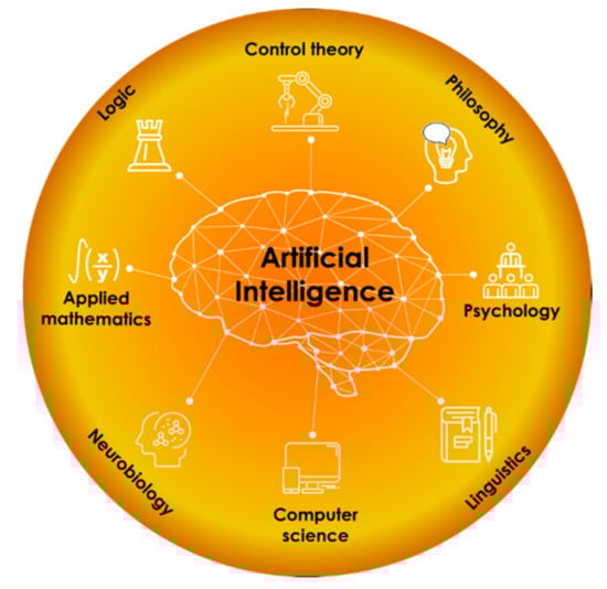 The field of artificial intelligence (AI) first emerged in the middle of the 20th century. The term “AI” was coined in 1956 at the famous Dartmouth Conference to emphasize the research field dealing with artificial systems that can imitate human-level intelligence. Nowadays, AI is a complicated and multidisciplinary area of expertise and cannot be described only by one theory. In our opinion, it would be better to determine AI’s place as a “crossing” of several science branches, as shown in Figure 1.