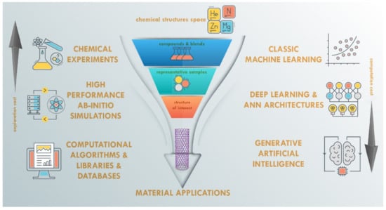 First of all, we initiate this section with a schematic picture (Figure 3) of the current computerized and AI-equipped approaches in the area of new functional material discovery. Usually, the conventional material discovery process starts from seeking the appropriate set of chemical substances and hands-on laboratory experimentation with blending and composing their part and proportions under various external conditions. As a consequence, these experiments have a rather high cost and take a lot of time for choosing, filtering, and finding the required structural properties. Reducing the impact of this issue can vary in the different ways that can be chosen by the researcher. The left side of Figure 3 shows well-established long applied approaches, but the right side presents the modern AI and deep learning until the perspective of generative AI models. It worth noting that the experimentation cost reduction is usually balanced by the increased computational cost.