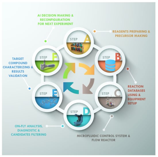 The pandemic crisis last year has seriously touched in synthetic chemistry workflow, resulting in the problem for the need for a remote-controlled mode of chemical experiments. All the instruments for on-line operation, even for sophisticated flow-chemistry equipment, have only been ready for several years [5], but still these techniques are not very well spread among the chemical community. The ideology of cloud chemistry (i.e., conducting on-line operated chemical experiments using equipment located in someone else’s laboratory in analogy with “cloud computing”) [5] could also result in much more effective use of unique and expensive equipment. At the same time, the speed of artificial intelligence development nowadays takes the form of a revolution almost in all fields of our life, including science and research and development (R&D) sectors [6,7]. Moreover, an AI-driving laboratory could be in operation 24 h a day and 7 days a week, thus the search for novel materials could be done much faster than in a standard human-operated laboratory. Automation of laboratory operation could also minimize the “human factor” as a reason for occasional mistakes. Intrinsically digitized complete protocols of the experiments performed in a fully automated laboratory are also a very important advantage.