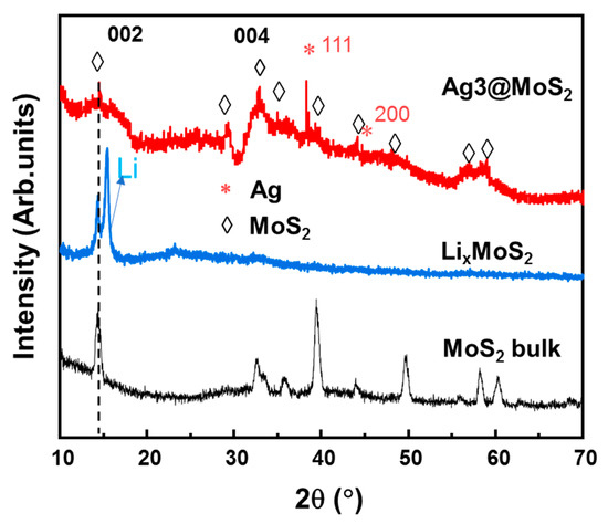 The structure of MoS2 and Ag-decorated MoS2 were analyzed by XRD. Figure 2 shows the XRD patterns of bulk MoS2, LixMoS2, and Ag-decorated MoS2 NSs. It is noted that the bulk MoS2 powder contains many peaks contributed by various planes in the lattice. However, after lithium ions are intercalated in the MoS2 layers, the XRD pattern of LixMoS2 has a main peak for the (002) plane of MoS2 at ~14.36° and a peak at 15.1°, which is related to the interlayer plane of Li between the MoS2 layers. The other peaks were much reduced and negligible due to the high intensity of (002) plane. After exfoliation and Ag decoration, the sample shows some main peaks for MoS2 at ~14.4°, ~29.0°, and 32.7°, which correspond to the (002), (004), and (100) planes according to the #JCPDS card number 00-037-1492. The XRD peaks of MoS2 are broadened in comparison to those of the bulk material. According to the Scherrer equation, the average size of the crystals can be calculated by D = 0.9λ/βcosθ, where D is the average size, λ is the X-ray wavelength, β is the full width at half maximum of the peak, and θ is the diffraction angle. Thus, the broadening of these peaks indicates small crystal sizes in those planes, which implies that the bulk MoS2 material was exfoliated into nanosheets. These results are similar to other synthesized MoS2 nanosheets by bottom-up methods such as hydrothermal method and hot injection method [34,35,36,37]. The appearance of Ag peaks for the (111) and (200) planes confirms the successful reduction of AgNO3 into Ag nanoparticles.