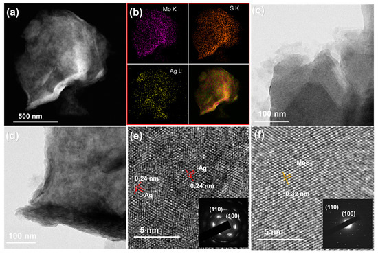(a,b) Transmission electron microscopy (TEM) image and element mapping images of Ag3@MoS2 materials; (c,f) TEM, high-resolution TEM (HRTEM) with inset selected area electron diffraction (SAED) pattern of MoS2 NS; (d,e) TEM, HRTEM with inset SAED pattern of Ag3@MoS2 materials.