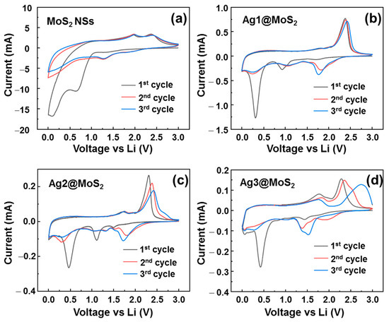 To investigate the effect of Ag-decorated MoS2 NSs on the electrochemical properties in lithium batteries, CV tests were performed at a scan rate of 0.1 mV·s−1 over the range 0.01–3.00 V (vs. Li/Li+). Figure 4a–d shows the initial three CV curves for MoS2 NSs and Ag1/2/3@MoS2 anodes. The electrochemical processes in the anode can be expressed by the following reactions: