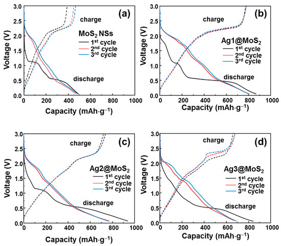 The initial voltage profiles of the as-prepared anodes are shown in Figure 5. It can be observed that with Ag decoration, the discharge/charge capacity of the MoS2 anodes is improved from ~500 to ~900 mAh·g−1, while the MoS2 NS reveals a low initial discharge/charge capacity of only ~490/466 mAh·g−1. Notably, the capacity does not decrease significantly during the initial cycles. The Ag1@MoS2 demonstrates a high initial discharge/charge capacity of 866/780 mAh·g−1 and ~800/773 mAh·g−1 at the 2nd and 3rd cycles, which is >92% of that of the first cycle. The Ag2@MoS2 anode exhibits a high discharge/charge capacity of 937/720 mAh·g−1 at the 1st cycle and ~773/739 mAh·g−1 at the 2nd and 3rd cycles. The enhancement of the lithium storage capacity could be owing to the Ag decoration improving the conductivity of the materials, thus, facilitating the lithiation/delithiation process. For the Ag3@MoS2 anode, the discharge/charge capacity is slightly reduced to ~840/660 at the 1st cycle and 694/679 mAh·g−1 at the 2nd and 3rd cycles, which can be attributed to the higher amount of Ag NPs, leading to stable cyclic performance. Meanwhile, the initial voltage profile of the MoS2 anode shows a sloping plateau at ~1.8 V, which is ascribed to the insertion of Li ions into MoS2, according to Equation (2) [26]. A sloping plateau at ~1.2 V corresponds to the reaction of lithium with sulfur in Equation (4). At below 0.5 V, the sloping plateau is related to the deep conversion reaction of lithium with MoS2 and formation of the SEI layer. The MoS2 NSs, Ag1@MoS2, and Ag2@MoS2 have similar reaction potentials. In contrast, the Ag3@MoS2 electrode has a higher plateau voltage at 2 V. The charging process of the Ag3@MoS2 anode also shows a higher plateau at ~2.4 V, higher than the plateau at ~2.2 V for the other electrodes. This process is because of a shift in the redox potential, which was indicated by the CV profiles of these anodes.