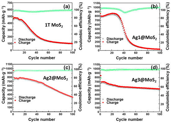 To further investigate the long-term cyclability, the performance of these anodes was analyzed in half-cells for 100 charge-discharge cycles at a current rate of 100 mA·g−1, as shown in Figure 6a–d. The MoS2 NS anode exhibits a stable cycling performance during the initial 15 cycles; however, the capacity gradually decays thereafter and remarkably fades from the 30th cycle to the 100th cycle to a capacity of ~100 mAh·g−1. This can be attributed to the formation of a broken MoS2 structure after the cycling process and a restacking of the MoS2 NS layers. By addition of a small amount of Ag nanoparticles, the Ag1@MoS2 anode improves the electrochemical performance for the initial 30 cycles; however, a dramatic capacity decay still occurs after that. A small amount of Ag enhances the conductivity of MoS2; however, the applied amount in the Ag1@MoS2 anode does not appear to be enough to protect the entire MoS2 structure. Thus, after 40 cycles, the MoS2 NS structure collapses, and the lithium storage capability worsens. A further increase in the amount of Ag diminishes the collapse of the MoS2 structure, leading to an enhancement in the cycling performance of the anode. The Ag2@MoS2 anode retains a capacity of 330 mAh·g−1 up to 100 cycles. The Ag3@MoS2 anode exhibits the best cycling performance; it retains a specific capacity of ~510 mAh·g−1 after 100 cycles, corresponding to a capacity retention of ~73%.