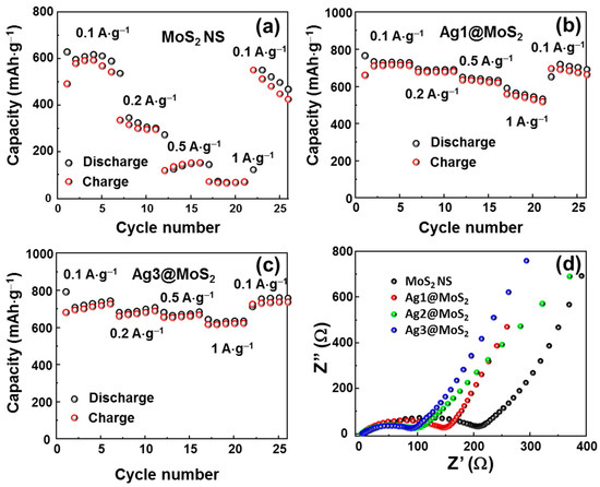 Rate performance of (a) MoS2 NSs, (b) Ag1@MoS2, (c) Ag3@MoS2, and (d) Nyquist plots of MoS2 without/with Ag-decorated anodes.