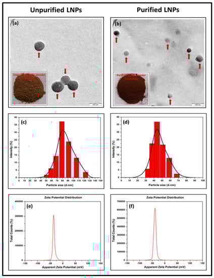 TEM micrograph and nanosized lignin powder (inset figure) of (a) unpurified lignin nanoparticles (LNPs) and (b) purified LNPs, particle size distribution of (c) unpurified LNPs (d) purified LNPs, zeta potential distribution of (e) unpurified LNPs and (f) purified LNPs.