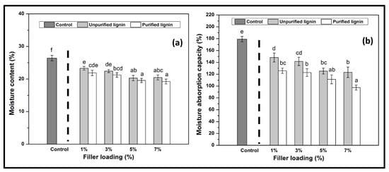 Figure 3 depicts moisture content (MC) and moisture absorption capacity (MAC) of Kappaphycus alvarezii macroalgae reinforced with unpurified and purified LNPs with different loadings. A pure polysaccharide is sensitive to moisture and water owing to its hydrophilic nature. Blending LNPs with macroalgae significantly reduced the resulting film’s MC and MAC percentage. The incorporation higher percentage of LNPs in macroalgae, resulted in a further decrease from 26.42 ± 0.84% to 20.46 ± 0.75% (unpurified LNPs) and to 19.24 ± 0.75% (purified LNPs), and from 179.25 ± 4.67% to 123.24 ± 8.85% (unpurified LNPs) and to 97.49 ± 4.22% (purified LNPs), respectively. This decrease in MC and MAC of the obtained films with filler loading was due to the partial miscibility of hydrophobic phenolic compounds of lignin and the strong formation of hydrogen bonding with the matrix []. A schematic illustration of LNPs interactions with macroalgae matrix incorporated after the cast is displayed in Figure 4.