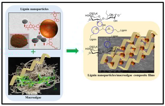 Recent studies have reported on the use of lignin in micro size as a reinforcement/filler in biopolymer matrix, such as starch [], protein [], polylactic acid [], polyhydroxybutyrate [], and bio-based polyamide []. However, nano-structured lignin as functional nanofiller in Kappaphycus alvarezii macroalgae is not previously reported in the literature. The present study aimed to develop and characterize lignin nanoparticles (LNPs)/macroalgae bioplastic film in this contribution. The macroalgae were incorporated with unpurified and purified LNPs from black liquor (soda pulping waste), and their functional properties were characterized. Several techniques and analysis methods observed the physical, mechanical, morphological, structural, thermal, optical, and wettability properties of prepared bioplastic films. The isolation of lignin from the industrial waste is a major contrition to waste valorization (for example the pulp and paper industry). Since lignin is hydrophobic in nature (thermoplastic behavior), the incorporation of lignin nanoparticle in macroalgae to improve its hydrophobic for industrial applications is a novel challenge.