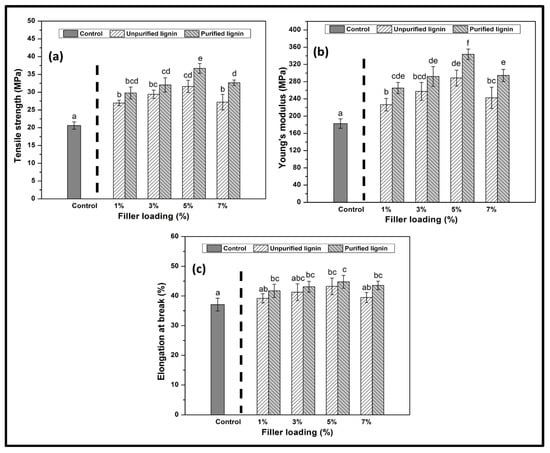 Figure 5 exhibits the mechanical properties, namely tensile strength (TS), Young’s modulus (YM), and elongation at break (EAB) of pure macroalgae films, unpurified and purified LNPs-reinforced macroalgae composite films. It was observed that the neat film showed the lowest mechanical properties. The addition of LNPs subsequently improved the mechanical properties of macroalgae-based films. Introduction of 1% unpurified and purified LNPs provided significant enhancement (p < 0.05) of TS and YM, for approximately 30.64 and 44.30%, respectively. However, the optimum TS and YM values were observed for 5% purified LNPs of 36.70 ± 1.38 MPa and 343.59 ± 12.32 MPa, respectively. This enhancement in mechanical properties may arise from the greater dispersion in the lignin nanostructures blend, which has a high surface area []. Plasticizers enhance the miscibility between hydrophobic lignin nanofillers and hydrophilic macroalgae molecules. The plasticizer enhances the interfacial miscibility of the two polymers []. The strong intermolecular interaction of hydroxyl groups between the LNPs and macroalgae enhances its mechanical properties [].
