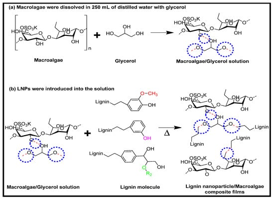 The elongation result describes the flexibility of the composite films. Elastic and flexible plastic product’s ability is significant in applications such as food packaging, agriculture, and cosmetics [,,]. The data showed that the incorporation of 1% of the nanofillers provided significant improvement (p < 0.05) of elongation at break (EAB) values. The difference in loading on the macroalgae films increased the EAB values from 37.08 ± 2.15% to 44.76 ± 2.16%. It was observed that the composite films showed greater elongation than the control film. The biocomposite’s elongation gradually increases with the loading of unpurified and purified LNPs from 1% to 5%. However, the elongation of the film decreased by 7% nanofiller. The addition of LNPs at high concentrations (7%) could probably interrupt the macroalgae-glycerol (plasticizer) bonding and eventually decreased the elasticity and flexibility of the composite films. Besides, this observation also agreed with the nanocomposite hydrogel reinforced by biorenewable lignin nanoparticles []. The mechanism of possible chemical reaction of macroalgae matrix and glycerol with LNPs is illustrated in Figure 6.